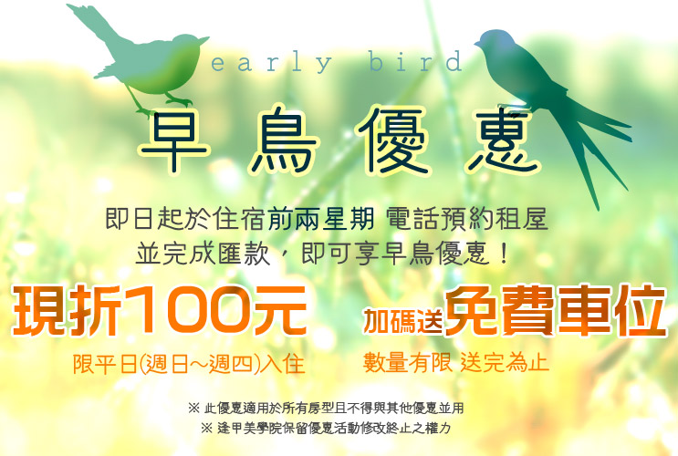住宿前兩星期,電話預約租屋並完成匯款,即可享早鳥優惠!